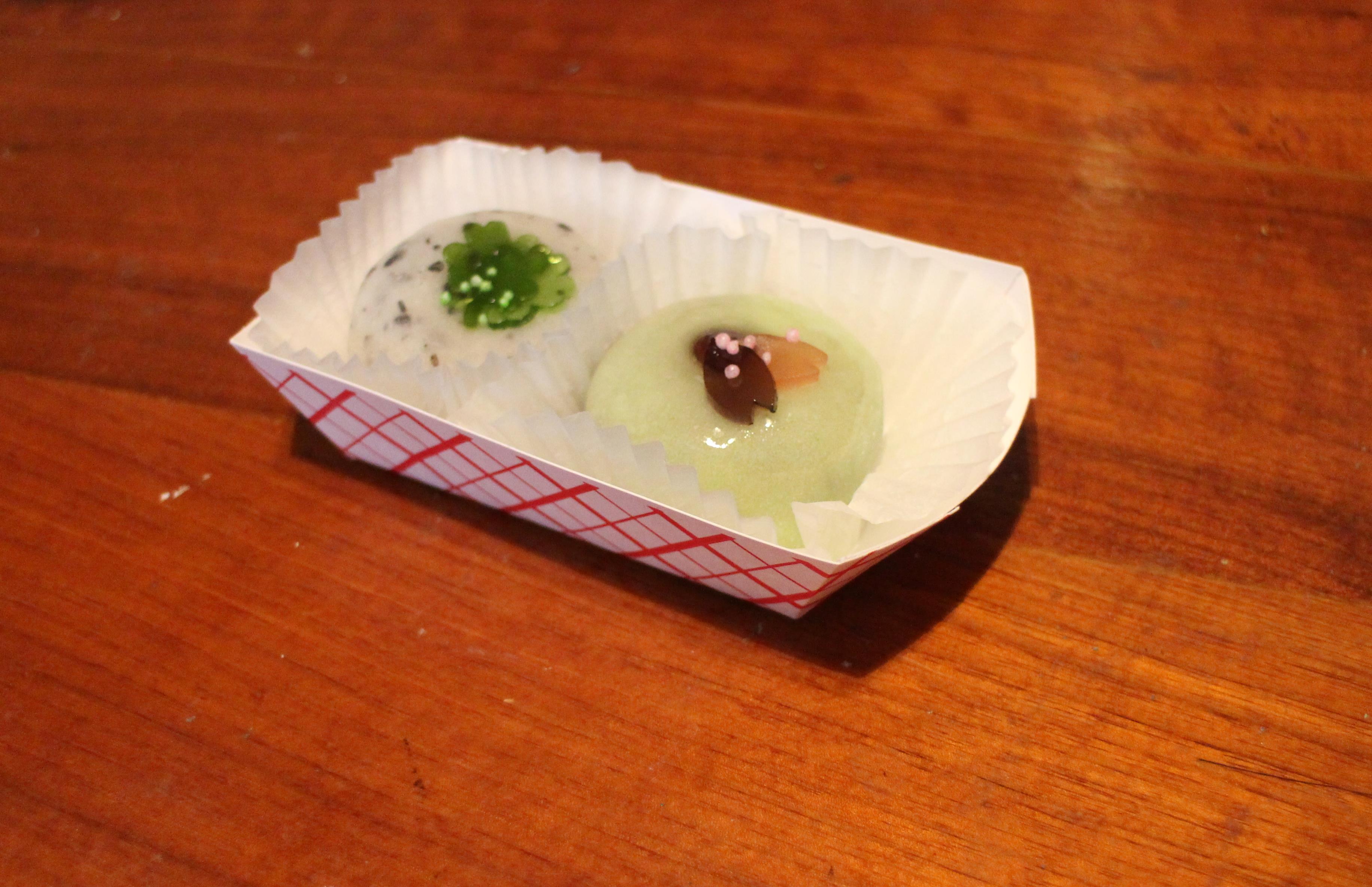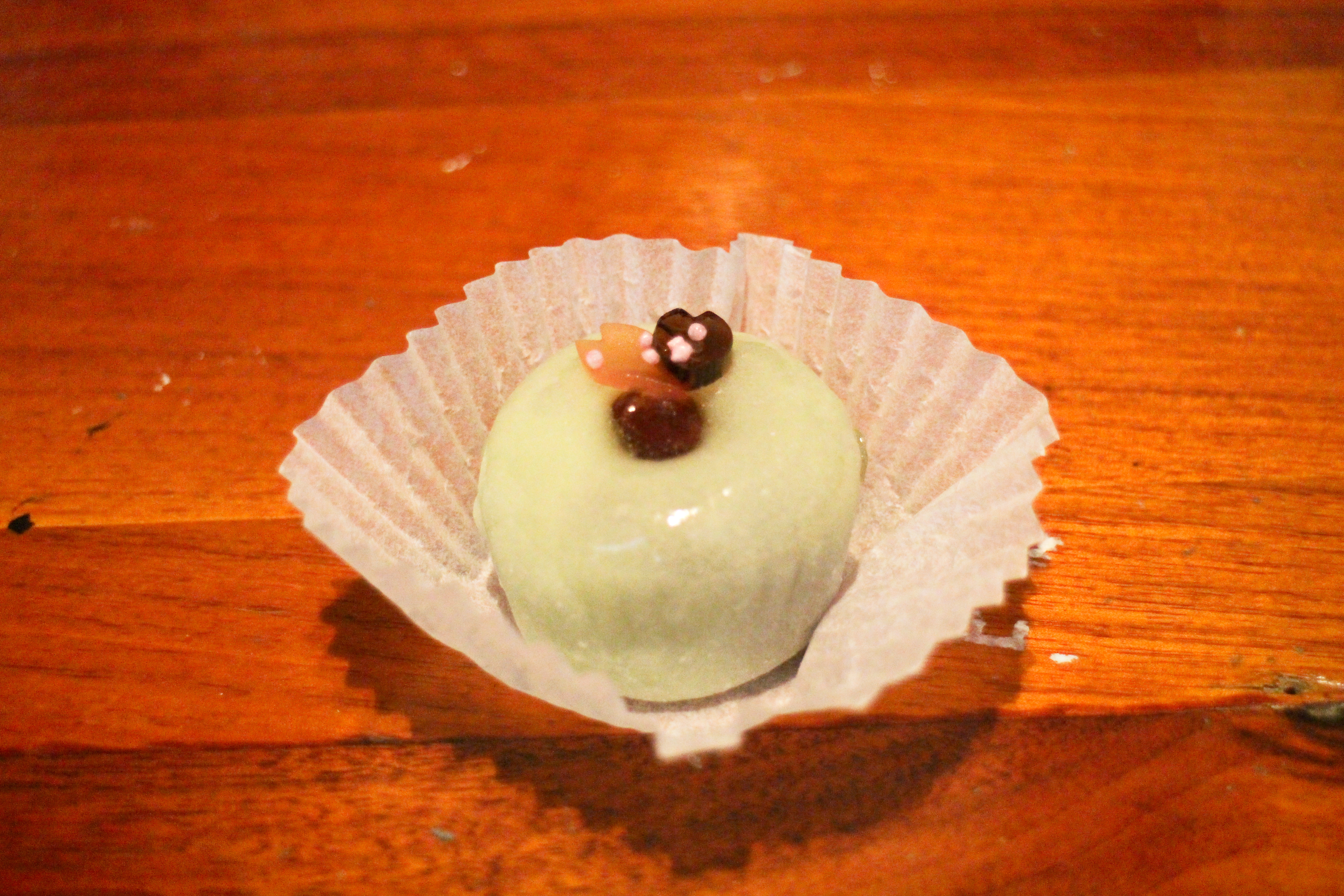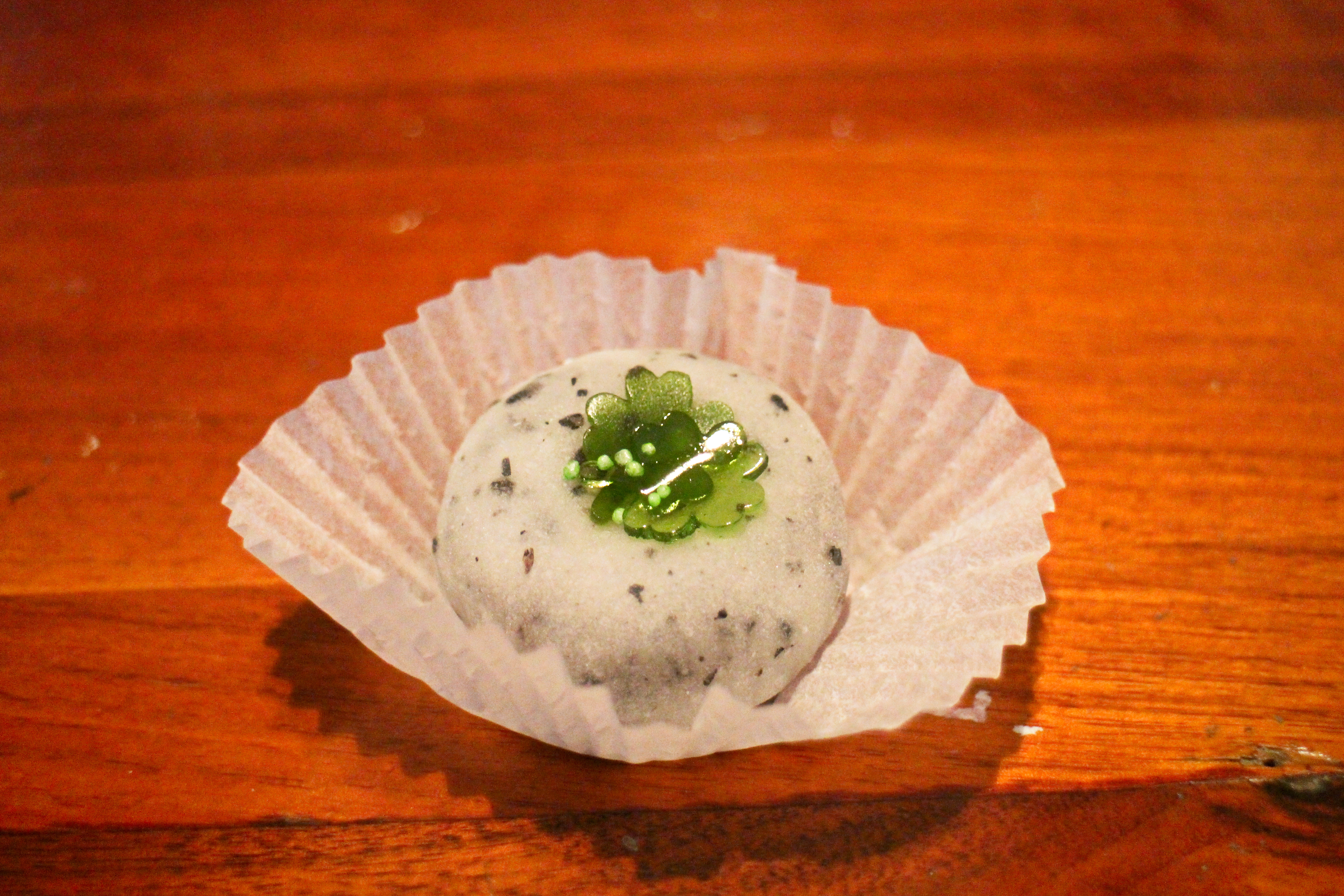 The whitish gray one was topped with shamrock-shaped jellies (for St. Paddy’s Day), which I thought was very cute. The light green one was topped with a whole red bean and some leaf-shaped jellies, and the skin on this was was glazed over the top, and a bit softer and thinner than the whitish gray one. They were both delicious and I’m really glad I stopped for these.