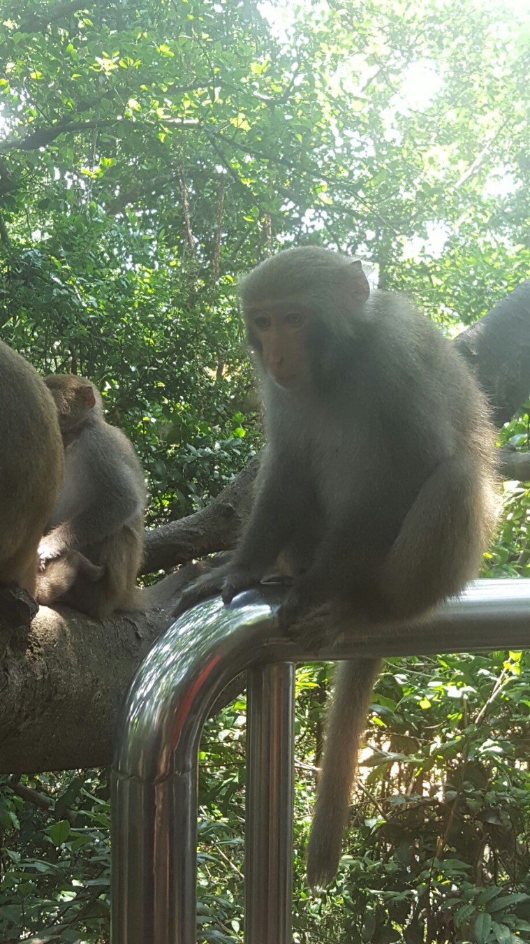 They weren’t that shy around humans- they just kind of did their thing and looked at us with curiosity for a while. We met a nice man there beside the monkeys who told us some interesting facts about this particular population of monkeys and their habits. In front of human food, they can get aggressive and they are also known to assert their right to the land against other local animals like the barking deer and wild pigs and dogs. He said that we should remember that even though we as humans tend to think we own everything, the monkeys are the true kings of this mountain. We also learned that monkeys live in heirarchical tribes, and as we were talking to the man, he pointed out a “king” monkey that walked onto the path. The monkey was large and intimidating. He even took an angry swipe at a passing female hiker! We had to stay totally still until he left the path to avoid angering him more. After that scary encounter, we thanked the man for his free monkey lesson and carried on up the trail.