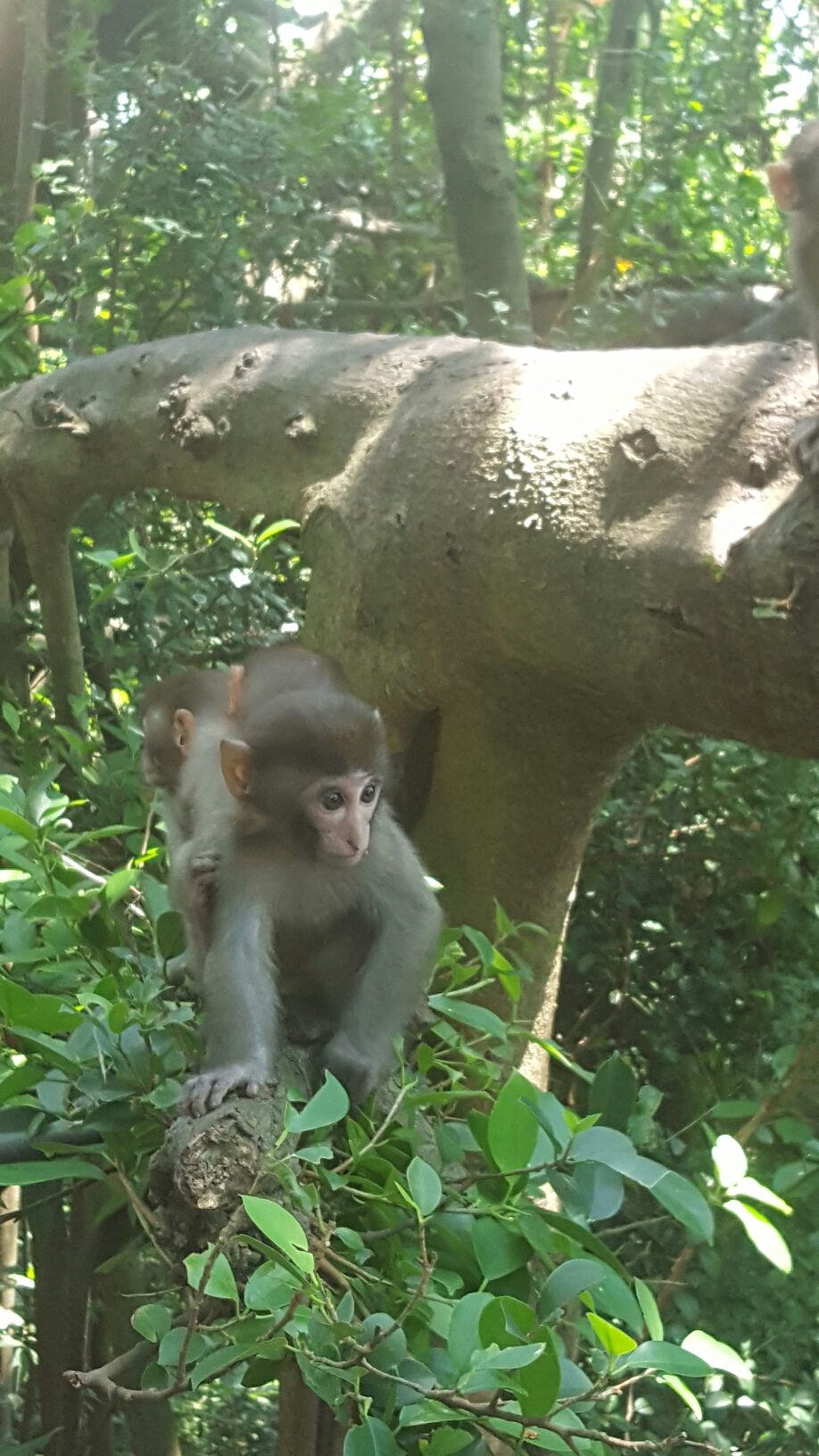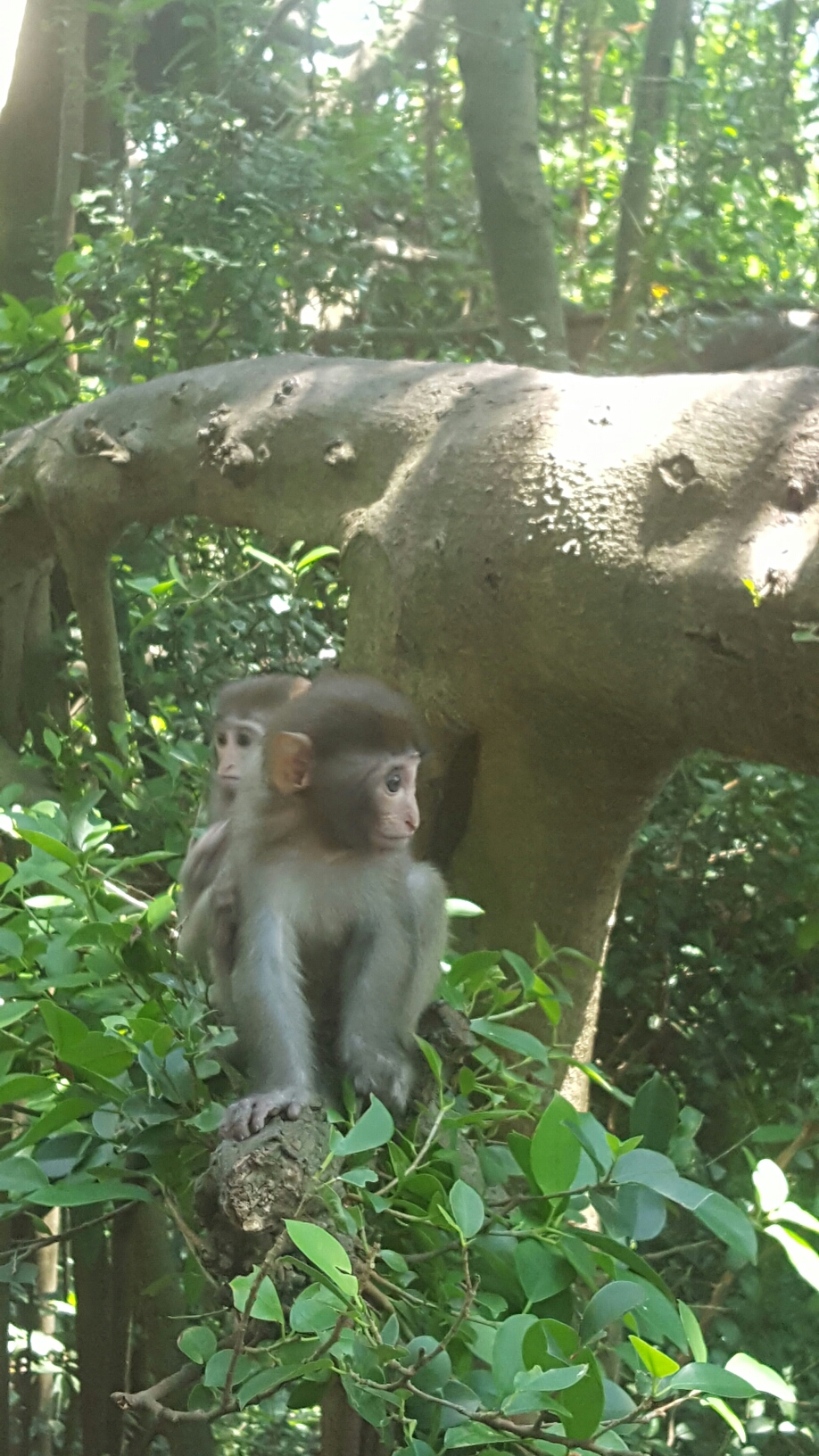 They weren’t that shy around humans- they just kind of did their thing and looked at us with curiosity for a while. We met a nice man there beside the monkeys who told us some interesting facts about this particular population of monkeys and their habits. In front of human food, they can get aggressive and they are also known to assert their right to the land against other local animals like the barking deer and wild pigs and dogs. He said that we should remember that even though we as humans tend to think we own everything, the monkeys are the true kings of this mountain. We also learned that monkeys live in heirarchical tribes, and as we were talking to the man, he pointed out a “king” monkey that walked onto the path. The monkey was large and intimidating. He even took an angry swipe at a passing female hiker! We had to stay totally still until he left the path to avoid angering him more. After that scary encounter, we thanked the man for his free monkey lesson and carried on up the trail.