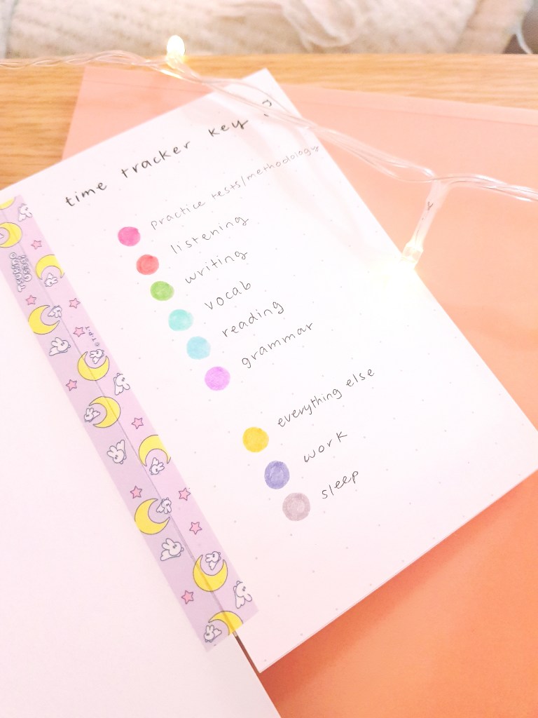 I realized I had a lot of different activities and types of studying I wanted to track on the planning pages and in the daily time tracker, so I made this card with a corresponding color for each type of activity. I simply glued two pieces of paper together to make a sturdy card, wrote out my key, and taped it into the back cover using this adorable Sailor Moon washi tape, which I also bought while in Tokyo. Now, whenever I need to fill in the planner, I can simply flip the card out from the back cover to see my color coding key. It makes planning and tracking much easier.
