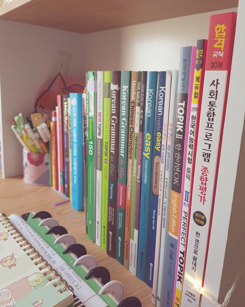 Today I wanted to give a quick tour of my bookshelf where I keep all of my Korean leisure books and textbooks. I love seeing what learning and reading materials other people like to use, so I thought I’d share my collection as well!