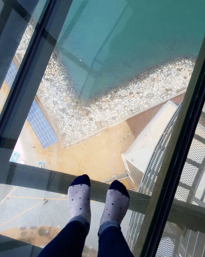 After filling up at the cafe, we packed some pastries to go and headed on to this seaside park and rest stop. There is a tower related to water services, but you can go up to the lookout deck for free to take in the scenery. They even have a glass floor that you can stand on for a trippy view of the ground straight below you. I love tall buildings, viewing decks, etc, but my boyfriend is not as big a fan as me, so he opted to skip the glass floor. (A little too scary for him, I think. ^_^)