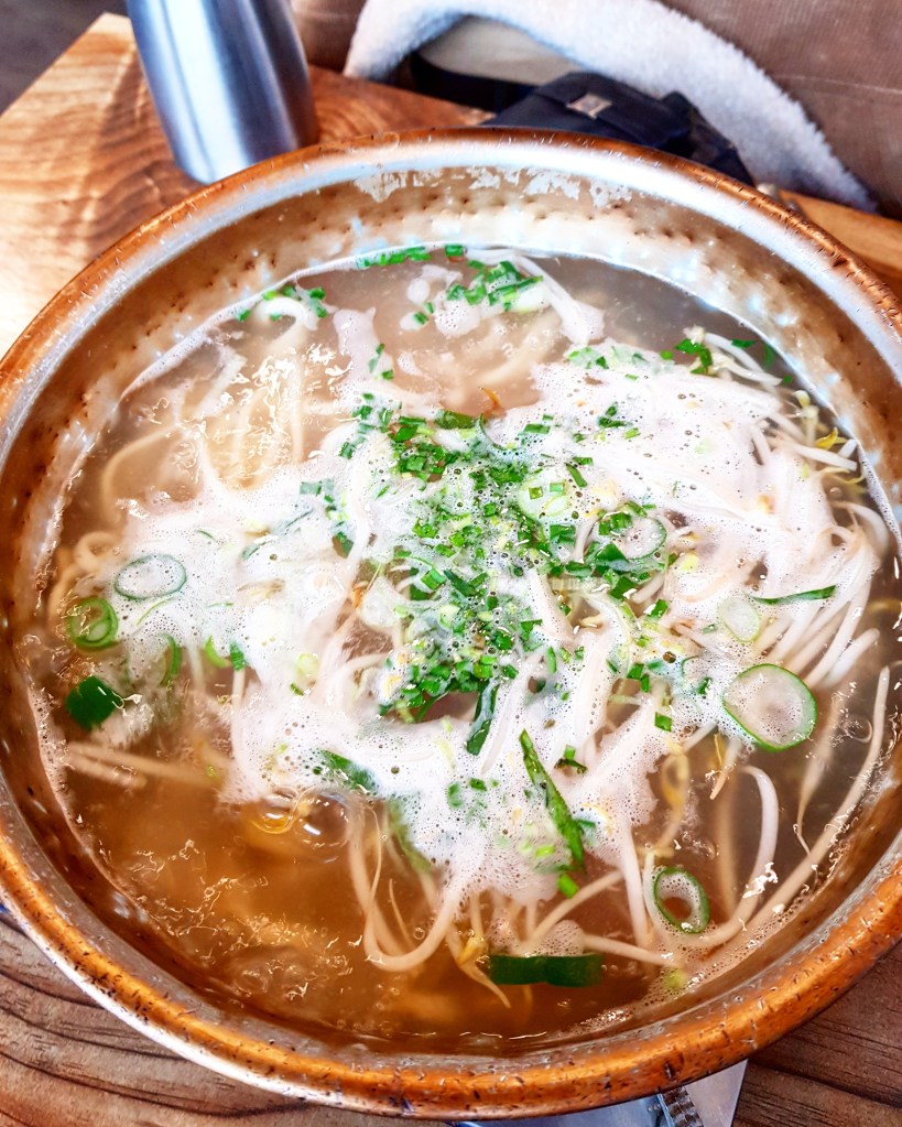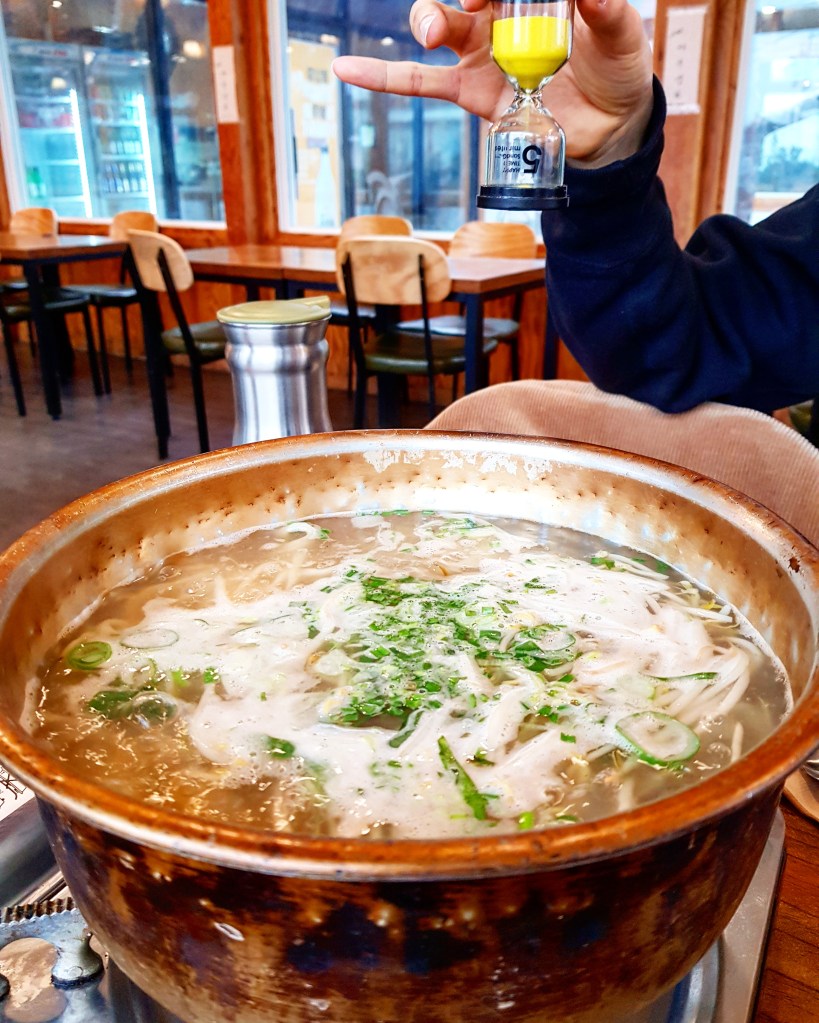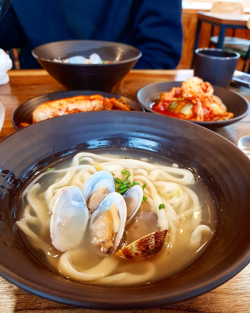 Before heading home, we had to stop at a local restaurant because we were both starving. We found the nearest restaurant we could and went straight in, so I honestly can’t tell you where it is or what it’s called because neither of us remember anything besides being hungry! The restaurant we found served primarily 칼국수 (knife-cut noodles) with seafood, so we ordered a basic meal for two with clams in the broth. They bring out a boiling hot pot of the noodles and give you a glass sand timer so you know when it’s ready to eat. Watching those grains of sand slowly fall down is tough when you’re so hungry! When the time was up, we both chowed down and it was the perfect meal after a long, chilly day.