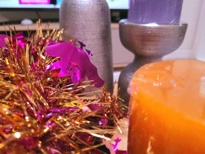 Next, I picked out two different types of party garland. I admit, they are a bit too bold for the theme I was going for, but I still liked the color combinations. I think they’re a bit too bold for everyday use, but I plan to save them until Halloween weekend to add some last-minute flare.