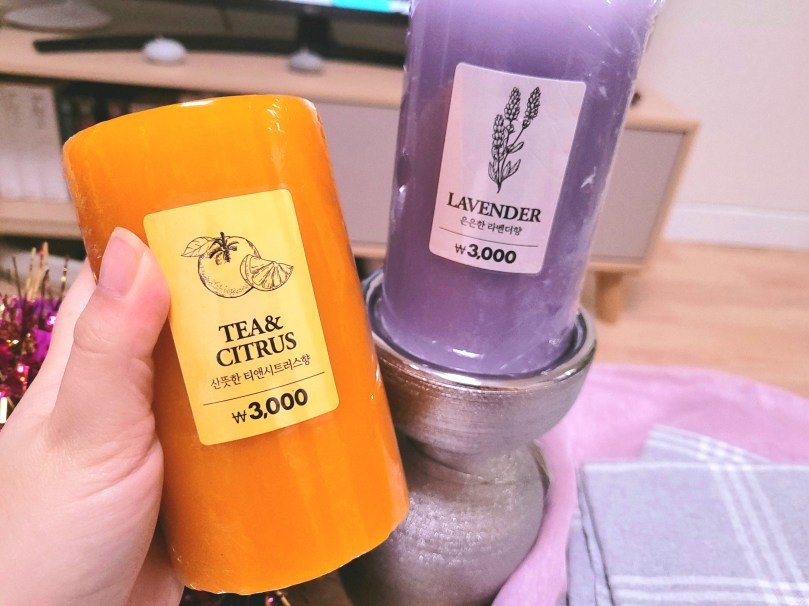 Then I headed to the candle section! I had a hard time settling on colors, since Daiso had such a wide variety. Before settling on a brighter, lighter color scheme, I thought about going for something more earthy and rustic. Brown, burgundy, tan, etc. But once I set eyes on the lavender candle, I new I needed to go in a new direction. I was also pleasantly surprised to find this light orange candle in the Tea & Citrus scent, so I bought both. What’s Halloween without a little orange in the mix?