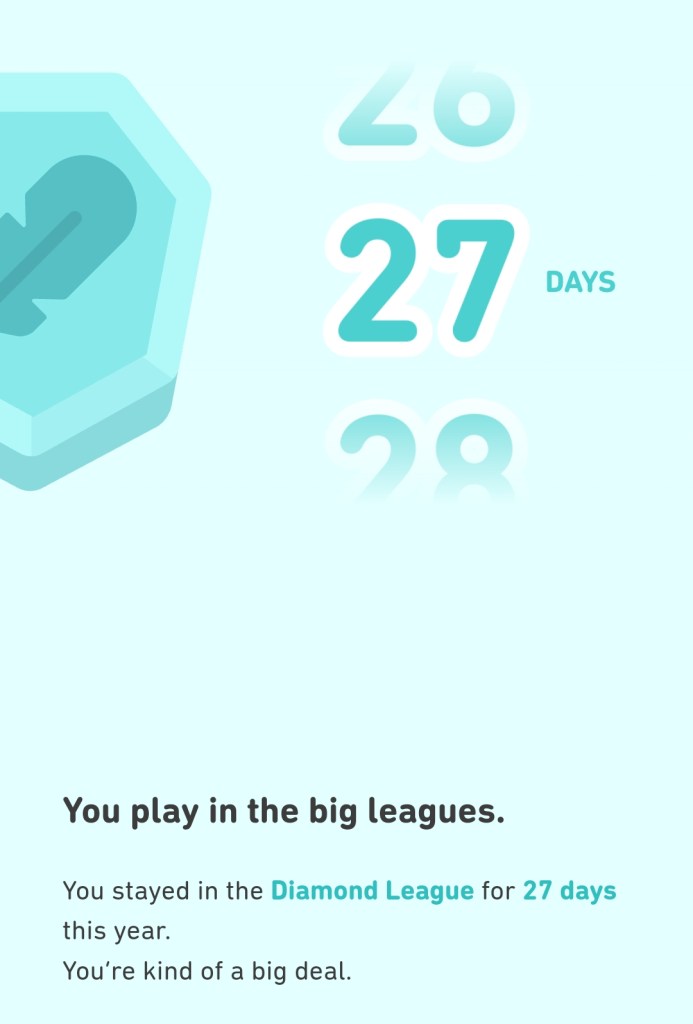 The Diamond League is the top league that Duolingo has. I strived really hard to get into the Diamond League and to rank #1 while in it, but only because I wanted to get the Level 10 Champion Badge (“You made it to the Diamond League”) and the Legendary badge (“You finished #1 in the Diamond League”). I’m not super obsessed with staying in a top league all the time, but it’s fun to compete once in a while.