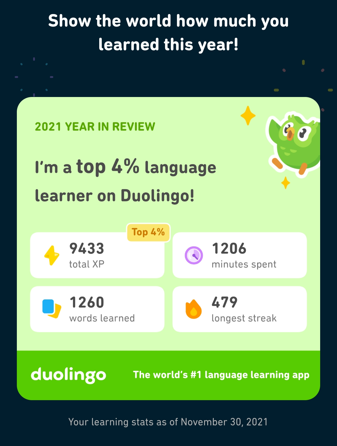 At the new year, Duolingo released a year-in-review report for users that broke down minutes learned, XP earned, and other interesting stats. In today’s post, I’ll be sharing my numbers for 2021 (through November 30th) and also reflecting on my Duolingo usage for the past year. Let’s go!