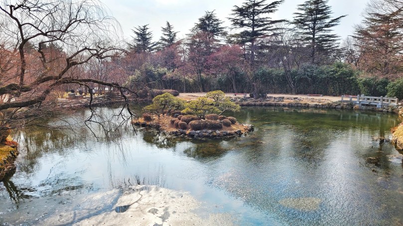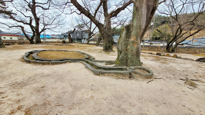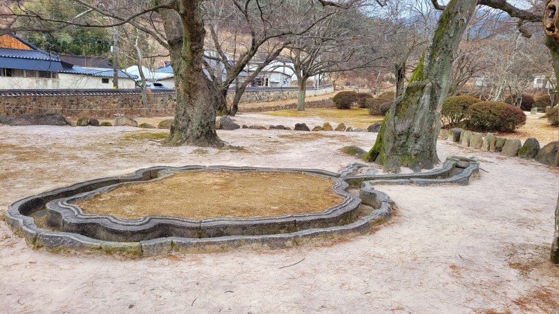For our first outing of the day, we went to Poseokjeong. This area was once the playground for royals and nobles, though more official business also took place here from time to time. The shape in the ground you can see in the images below was a water course that kings and their guests would sit around while they chatted and played drinking games. They would float glasses of liquor on the water course, the water for which was supplied by the well (now covered by a large stone).